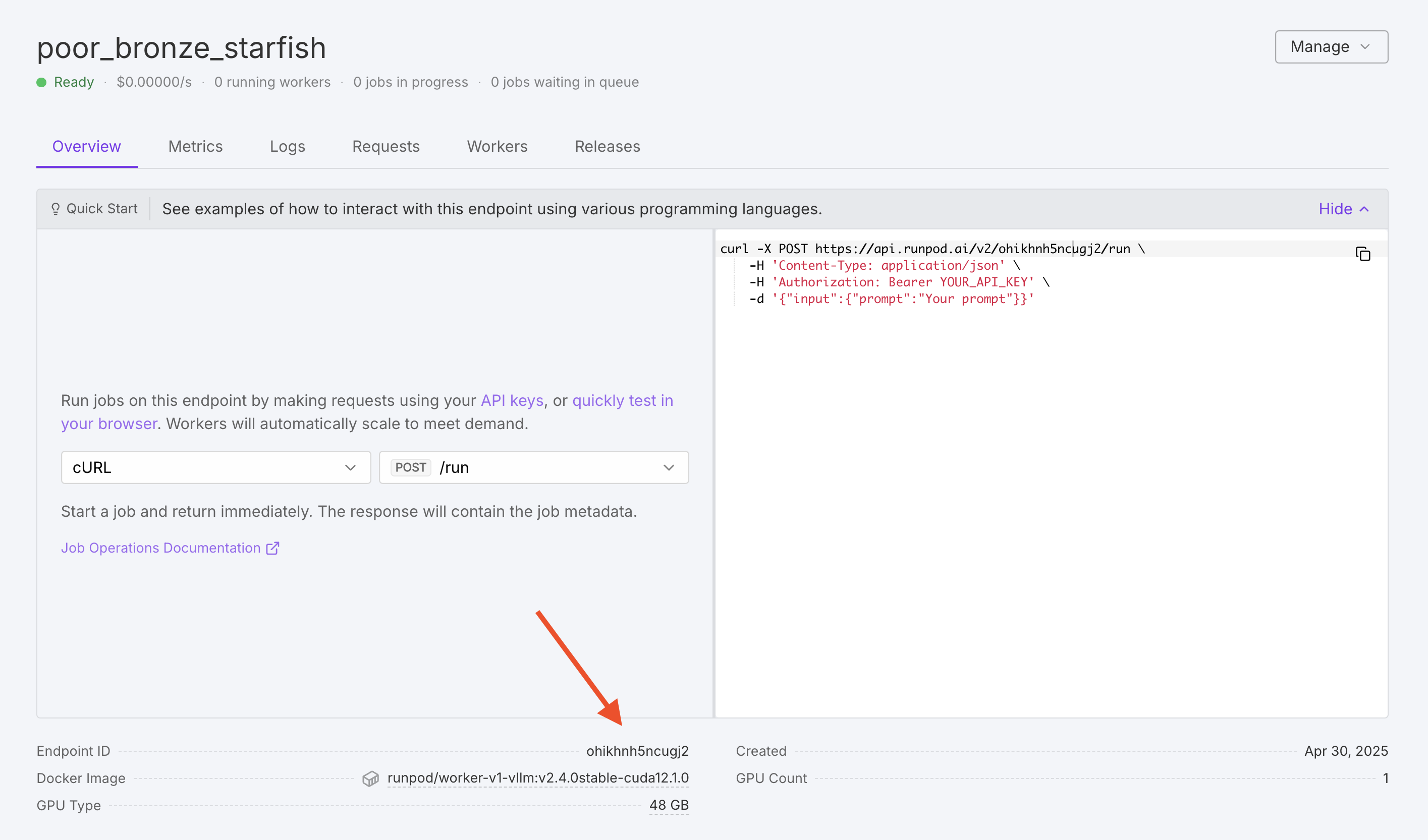 While your endpoint is initializing, let’s understand what’s happening and what you’ll be able to do with it. Runpod is creating a Serverless endpoint with your specified configuration, and the vLLM worker image is being deployed using your chosen model. Once deployment is complete, make a note of your Endpoint ID, as you’ll need this to make API requests.